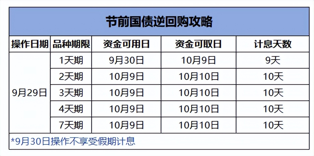 据上证报记者梳理,9月29日(周一)操作1天期、2天期、3天期、4天期或7天期品种均可享受假期利息,其中1天期逆回购可享9天利息,资金于9月30日可用,10月9日可取。