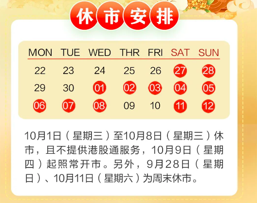 按照今年国庆中秋休假安排:A股10月1日(星期三)至10月8日(星期三)休市,10月9日(星期四)起照常开市。港股通10月1日(星期三)至10月8日(星期三)不提供服务,10月9日(星期四)起照常开通港股通服务。