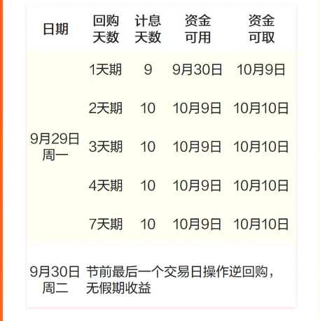 操作方法如下:9月29日操作1天期国债逆回购,收获9天利息,资金在9月30日盘前已处于可用状态。需要注意的是,如果是9月30日,也就是休假前一天再做国债逆回购,只能计算一天的利息,长假期间也不计算利息。