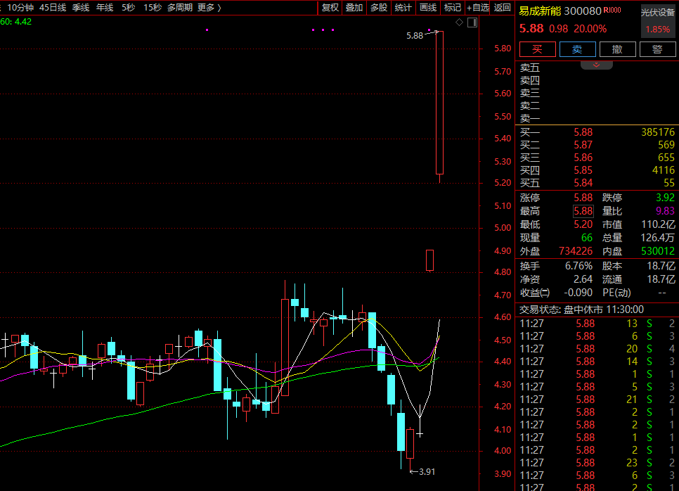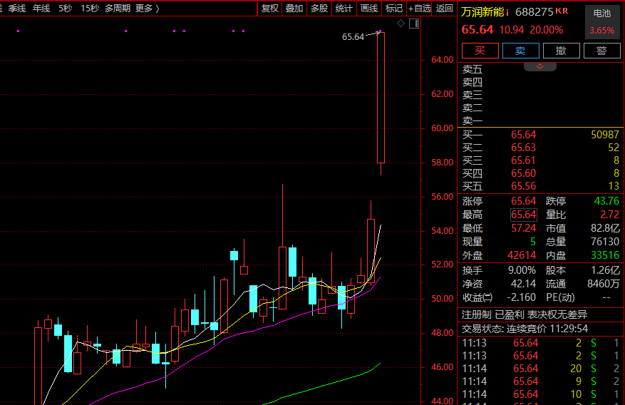 新能源概念股早间全线走强,电池方向领涨,板块指数盘中放量大涨逾5%,创3年多新高,半日成交接近前一交易日全天成交。万润新能(688275)高开后仅约10分钟就20%涨停,股价创年内新高,湖南裕能、天赐材料、石大胜华等涨停或涨超10%。