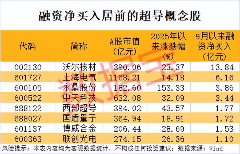 资金面上,截至9月26日收盘,9月以来融资净买入超1亿元的超导概念股有8只,包括沃尔核材、上海电气、永鼎股份、中天科技、西部超导等。