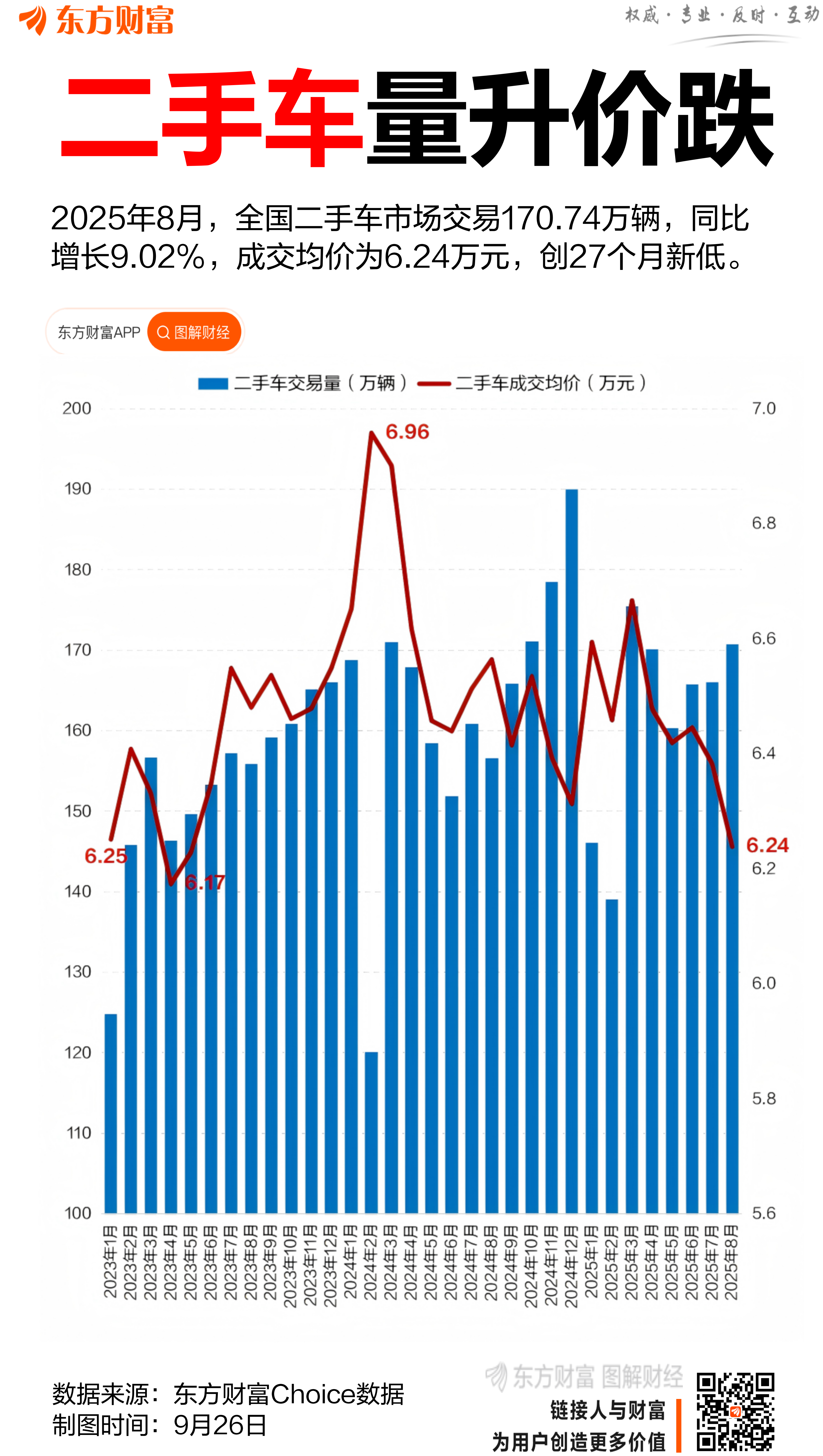 据东方财富Choice数据,2024年以来,二手车成交量整体保持稳定并有小幅增长,但成交均价有下降趋势,从2024年2月6.96万元的高点下降到2025年8月的6.24万元,创27个月新低。