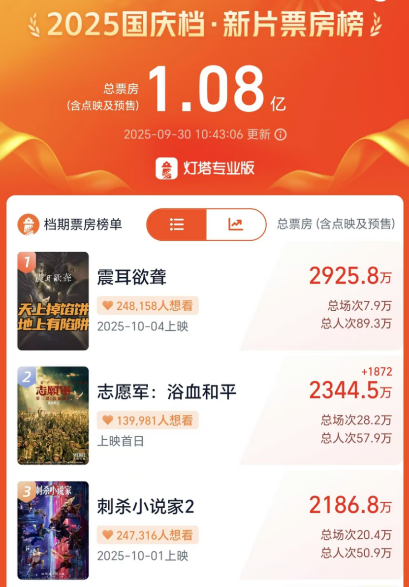其中,《震耳欲聋》票房接近3000万元,《志愿军:浴血和平》与《刺杀小说家2》均已超过2000万元。