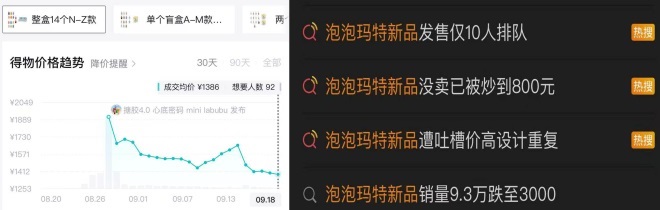 同时,mini版Labubu价格也出现大滑坡,得物平台8.28日成交均价为1916元,9.18日却仅为1386元,降幅达到27.7%。