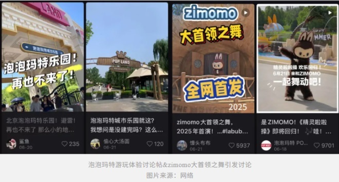 但线下乐园的开设,对于增强粉丝粘性、社媒出圈仍有一定助力。比如Zimomo大首领之舞在Labubu走红之后,在社媒平台得到进一步广泛传播,为品牌带来一定声量热度。