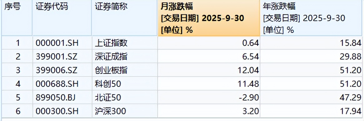 Wind数据显示,截至9月30日收盘,上证指数报3882.78点,单月上涨0.64%;深证成指报13526.51点,单月上涨6.54%;创业板指报3238.16点,单月上涨12.04%。