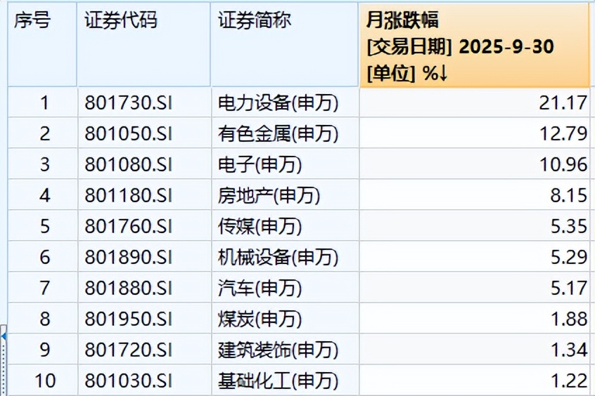 9月行业涨幅排名