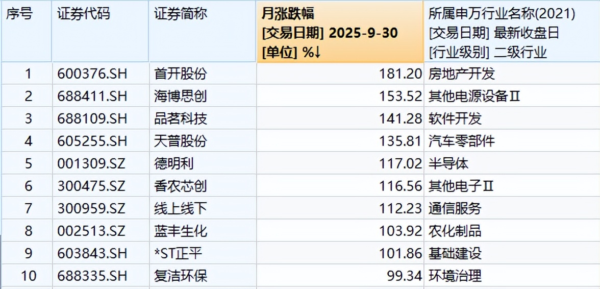 9月涨幅排名前十股票依次是首开股份、海博思创、品茗科技、天普股份、德明利、香农芯创、线上线下、蓝丰生化、*ST正平、复洁环保。其中,前9只股票单月股价完成翻倍。
