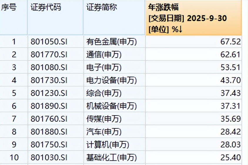 前三季度,有色金属行业与通信行业分别累计上涨67.52%和62.61%,分列前两位。电子行业累计涨幅53.51%,电力设备行业涨幅43.70%,综合、机械设备、传媒行业累计涨幅均超30%。