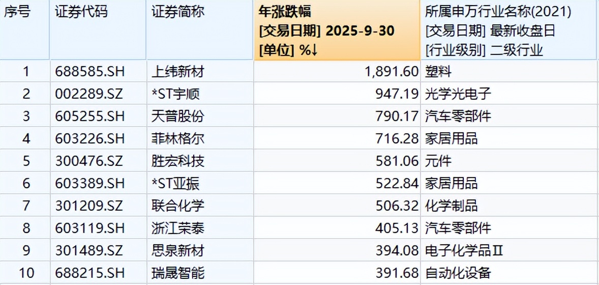 前三季度,上纬新材以1891.60%的巨大涨幅居首位,排名第二到第十的依次是*ST宇顺、天普股份、菲林格尔、胜宏科技、*ST亚振、联合化学、浙江荣泰、思泉新材、瑞晟智能,涨幅均超390%。