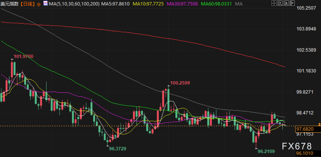 美元指数一度触及一周最低,盘尾报 97.68,跌幅为 0.2%。市场上出现了一些避险买盘,日圆等低收益货币受到追捧,美国公债和黄金保持坚挺。