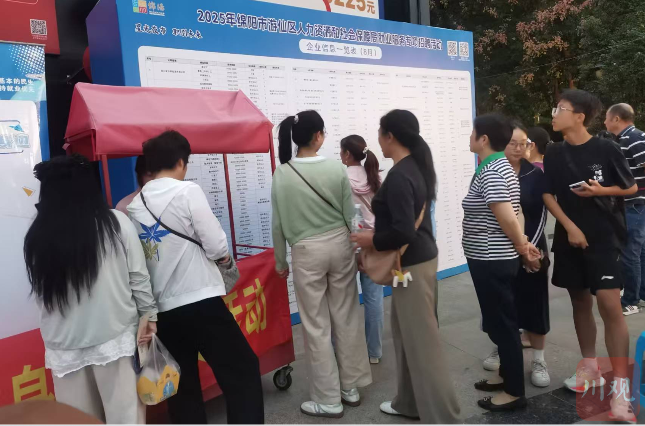 “来看一下招聘信息,扫码求职登记,送夜市消费优惠券哦。”在夜市旁边,一块写着密密麻麻用工企业招聘信息的展板,带来数百个工作机会。绵阳市游仙区人力资源服务产业园运营负责人汤丹杨和几名工作人员,正在热情地招呼过往人群,不时有人停下来仔细查看展板上的用工信息。