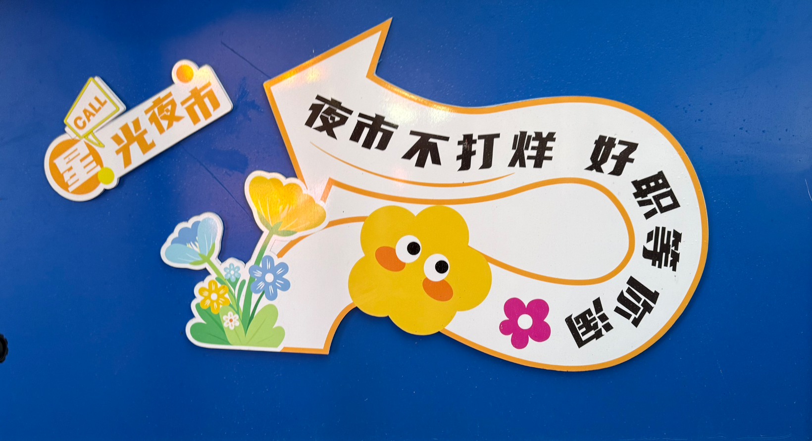 记者到达时,正是华灯初上夜市的热闹时刻。商贩们的摊位上,生蚝在炭火上滋滋冒油,脆皮肠烤得金黄酥脆,鱿鱼须在铁板上卷曲成花,油亮的茄子裂开笑纹……空气中飘散着诱人的香味,人们在喜欢的摊位前驻足,等着大饱口福。 “就业驿站 ”“创业孵化”“夜市不打烊 好职等你淘”等各种就业标语十分醒目。