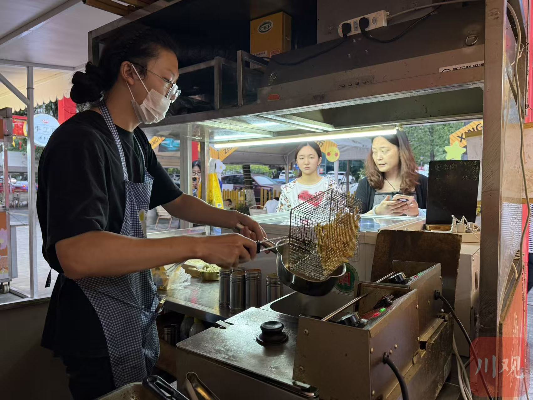 夜色渐浓,四川省绵阳市游仙区孔雀公园夜市逐渐热闹起来,90后青年周林富的炸蘑菇摊位上,等候购买的顾客围成了大圈。“我是逛这个夜市的时候,看到有招聘和学技能的信息。我学会了炸蘑菇后,就摆了现在这个摊。”周林富一边忙着手中的活,一边向川观新闻记者介绍他摆摊的缘由。