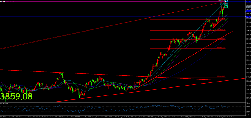 受8月1日公布的美非农就业数据疲软表现影响,金价逐步摆脱震荡走势,8月底金价开启单边上行形成的对3400向上突破走势,自此再度开启连续单边上行破位走高。美联储9月利率决议的落地并未缓和市场担忧情绪,金价短暂调整后恢复涨势。进入本周受美政府停摆影响,金价连续大幅冲高最高上探3895一线后震荡回落,当前金价回落企稳于3850上方。短线走低并未表现出空头强度上升,连续冲高需警惕多头阶段性盈利了结引发的价格下行。日线级别显示金价自8月22日以来形成对日线级别均线向上突破走势,整体日线移动平均线维持较为规整向上发散多头趋势指引参考,连续冲高日线级别RSI呈超买表现,需警惕高位回落日线级别调整走势。小时级别显示,短期金价震荡走低逐步完成小时级别RSI均值回归,当前金价企稳于小时级别60日均线支撑位价格上方,维持偏多震荡指引参考,短线下行做上涨趋势调整行情参考,回落幅度扩大仍将面临较为密集指标支撑位影响。四小时级别MACD随着短线回落出现高位死叉表现,四小时级别见顶表现逐步显现,短期金价继续扩大回落风险预期逐步上升。(本周五非农就业数据受美政府停摆影响有较大概率延期公布。)若本周非农数据继续录得符合预期或低于预期表现,仍将解读为有利于美联储进一步降息,将继续形成对金价提振影响,低于预期的幅度将成为金价上涨幅度的决定因素。若非农就业数据高于预期,将缓和市场悲观氛围,金价延续震荡走低扩大回落逐步带来四小时级别、日线级别调整走势预期较高。综上述,当前回落逐步显现多头疲态,中长期上涨趋势稳定,短期支撑回踩预期逐步上升。谨慎围绕多单做主要交易思路展开,针对短期回落以逢低多交易为主。下方关注3830、3795、3710。