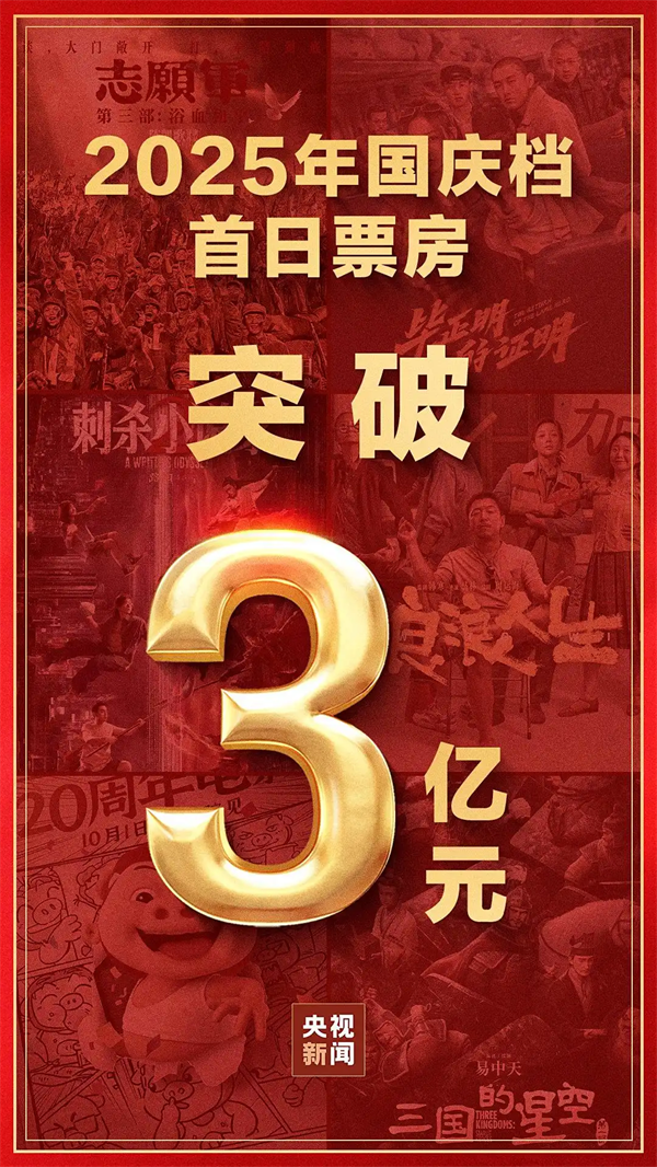 据猫眼专业版数据,截至10月1日16时05分,2025年国庆档档期票房破3亿,《志愿军:浴血和平》《刺杀小说家2》《731》分列前三位。