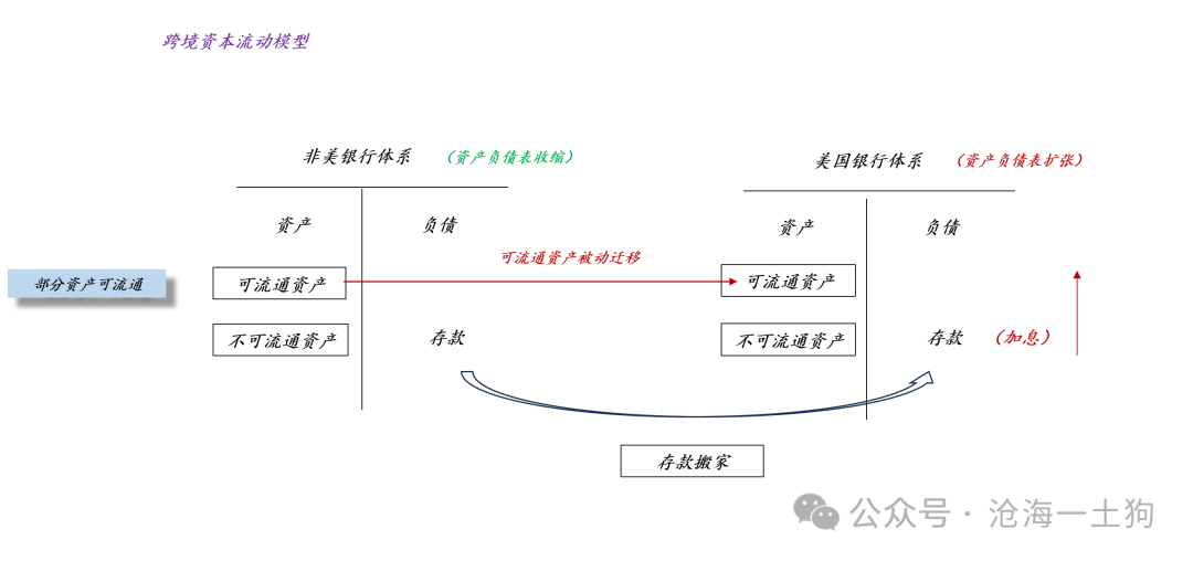 如上图所示,我们可以把美国银行体系和非美银行体系看成两家普通的商业银行,这两家银行遵循简单的“存款搬家”逻辑。如果美国是一个普通国家,那么,它不得不保持较高的联邦基金利率水平,否则,存款会大幅流出美国银行体系,导致美元贬值。