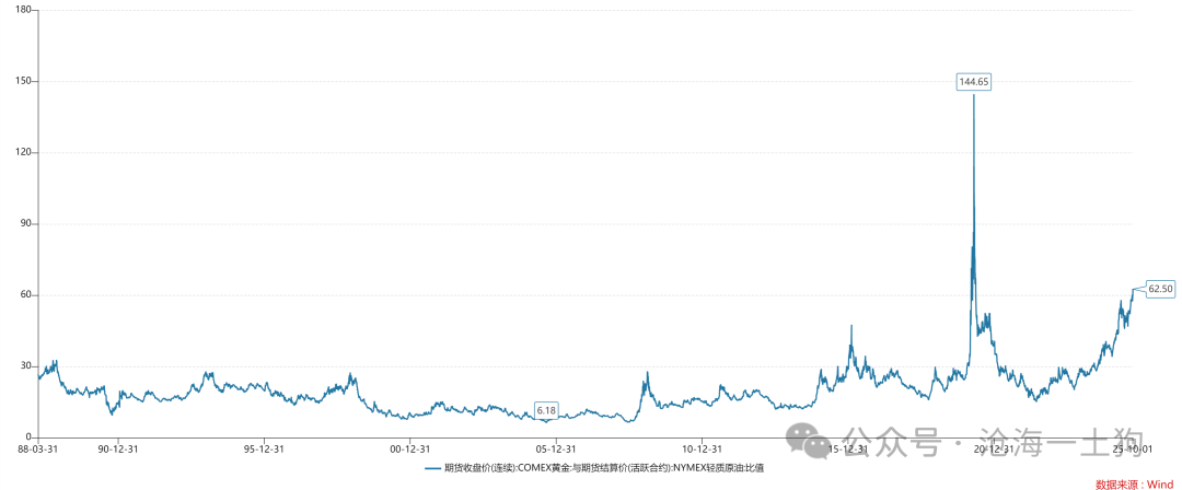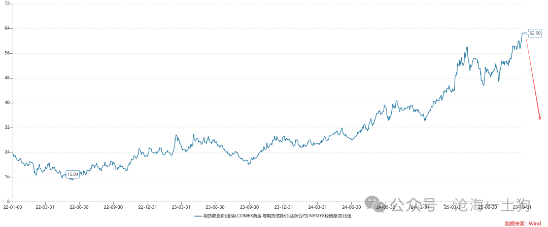 另一次是2022年俄乌战争爆发以来,金油比趋势性攀爬,已经震荡攀升至62.5附近;