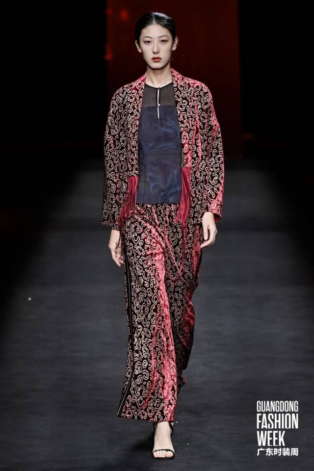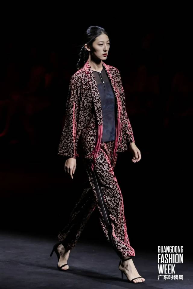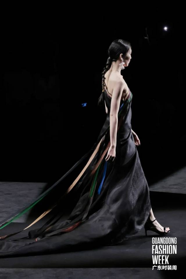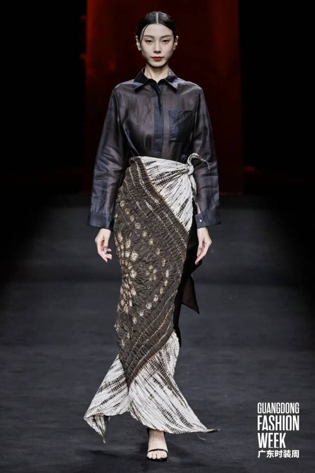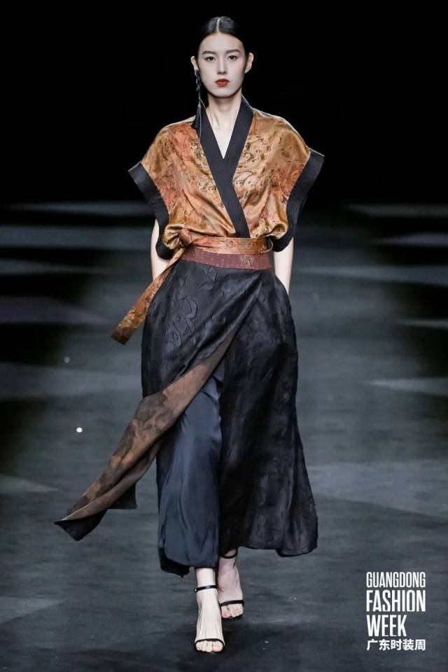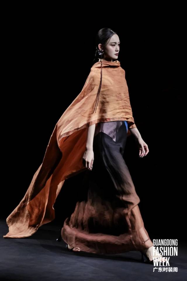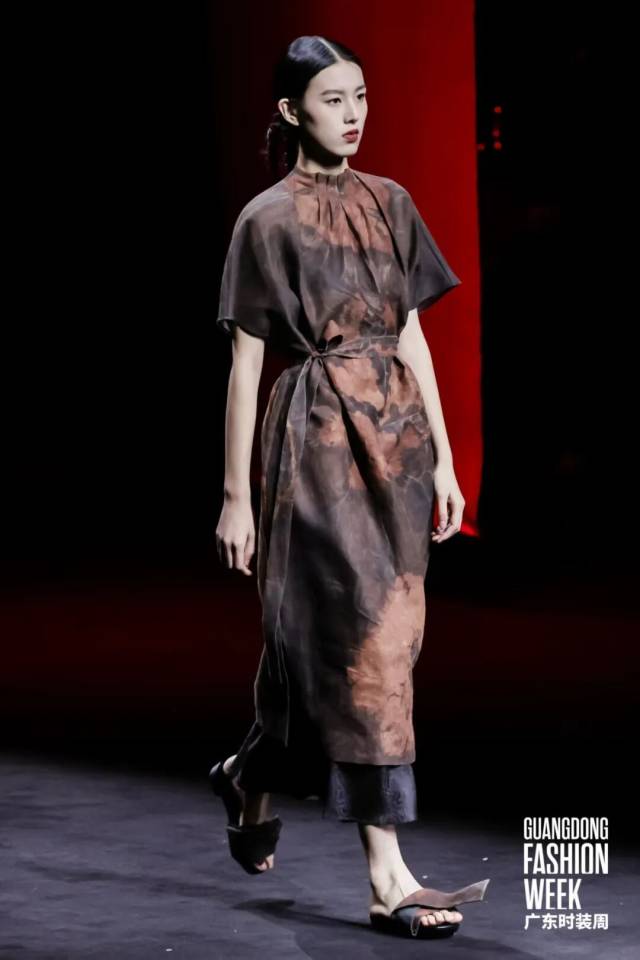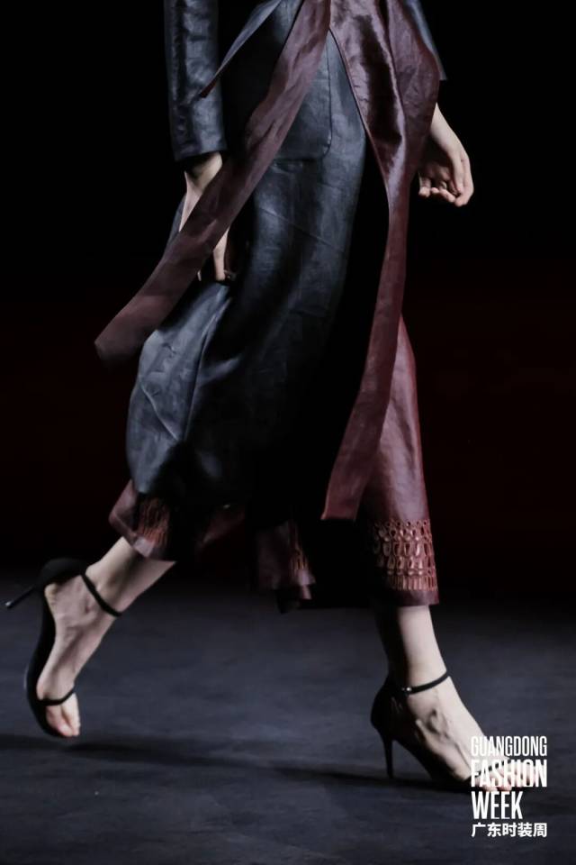 模特身着序香云纱漳缎 的服饰 款款而来,这画面恰是羅少对香云纱未来的生动注解—既要留住非遗沉淀的过往更要以设计为笔,续写它“一路生花”的新篇,让更多人在日常里遇见香云纱的千年魅力。