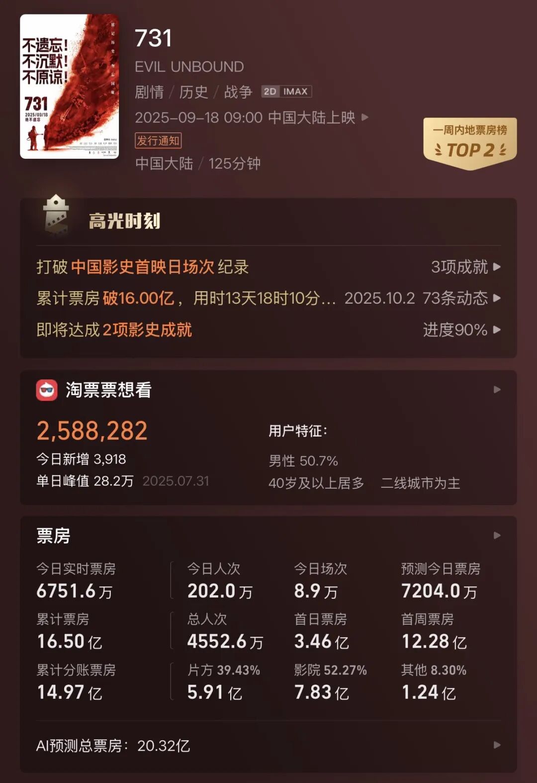 受大盘带动,一批上映已久的影片热度也明显提升。10月1日,上映近半个月的电影《731》,单日取得超过6000万元票房,累计票房接近16亿元。10月2日,该片总票房升至16.5亿元。