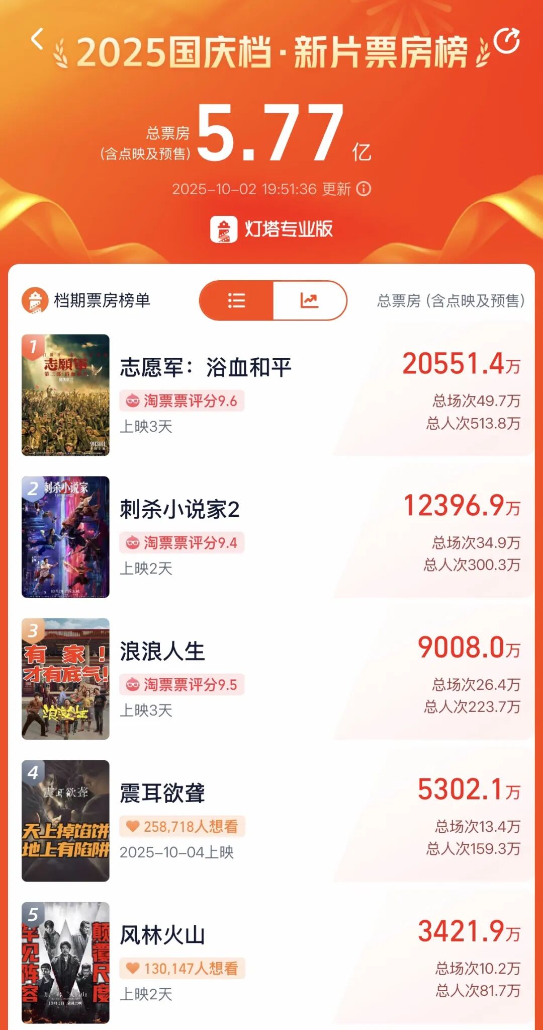 10月1日,国庆档单日票房达到3.25亿元,其中《志愿军:浴血和平》以23%的排片取得近30%的票房,单日票房接近1亿元,领跑市场。排在身后的《刺杀小说家2》和《浪浪人生》分别取得6362万元、3612万元票房。