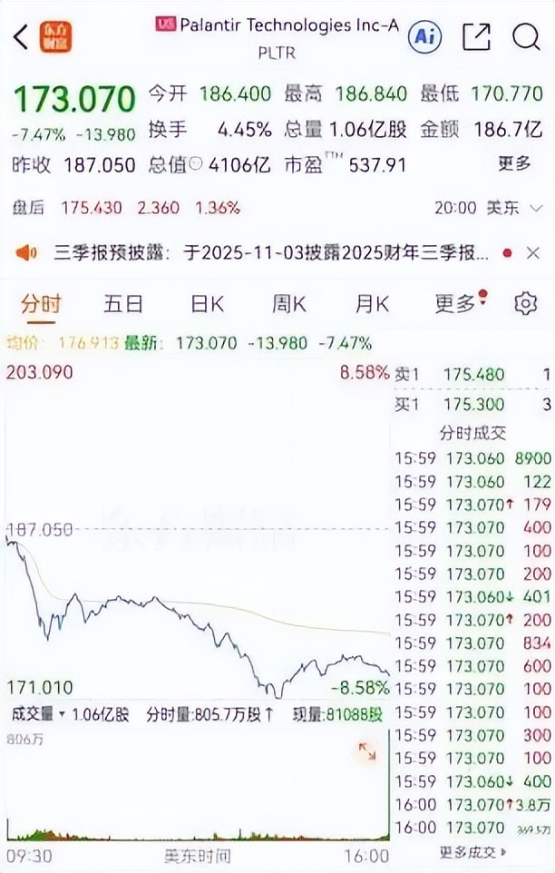 当地时间周五,科技公司Palantir的股价大幅跳水,盘中跌幅一度接近9%,最终收跌7.47%,单日市值蒸发超330亿美元。