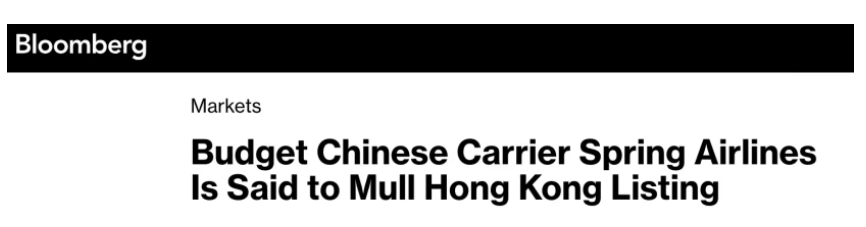 据彭博社报道,中国低成本航空公司春秋航空正考虑在香港上市,最快或将于明年进行。