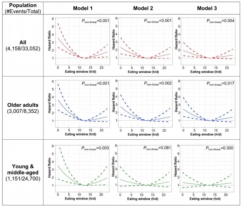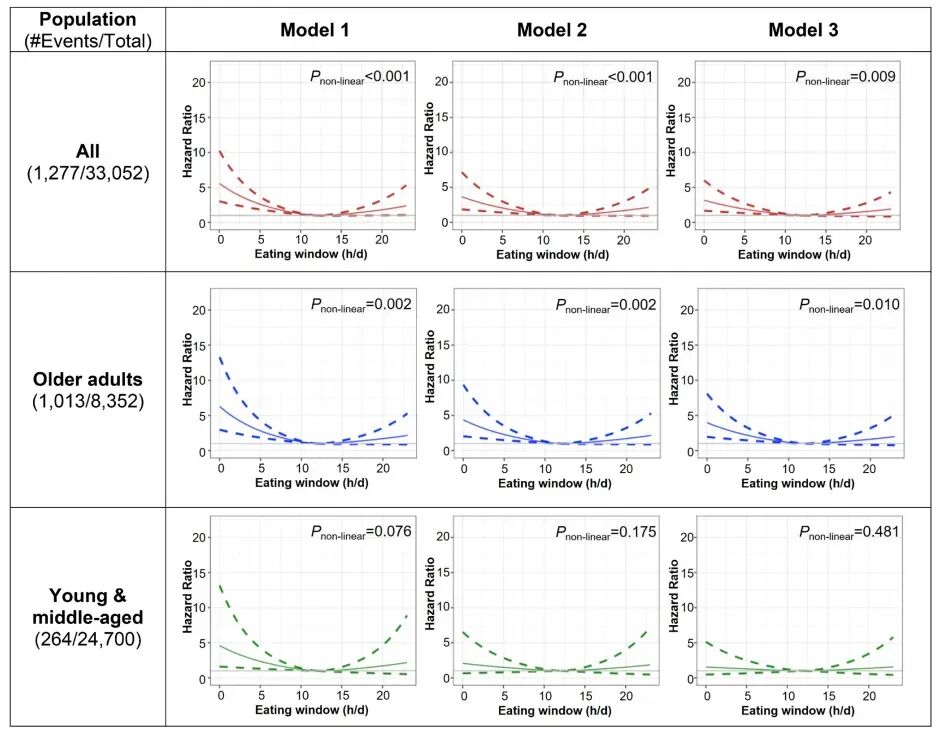 研究结果显示,进食时间窗与全因死亡率之间存在显著的U型非线性关系(图1)。具体而言,当进食时间窗约为11~12小时/天时,全因死亡风险最低(P=0.004)。较短的进食时间窗(≤8小时/天)与全因死亡风险显著升高相关,其风险比(HR)在完全调整模型中达到1.3及以上。与12.0~12.99小时/天的参考组相比,<8.00小时/天的进食时间窗类别使全因死亡风险上升34%(HR=1.34,95%CI:1.07~1.67,P=0.012)。此外,较长的进食时间窗(≥15.0小时/天)也与全因死亡风险升高25%相关(HR=1.2595%CI:1.01~1.55,P=0.041)。这一结果表明,进食时间窗过短或过长均可能对健康产生不利影响,而维持适度的进食时间窗(约11~12小时/天)可能有助于降低全因死亡风险。