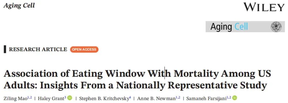 MAO Z, GRANT H, KRITCHEVSKY SB,et al. Association of eating window with mortality among US adults: insights from a nationally representative study[J]. Aging Cell, 2025:e70230. DOI: 10.1111/acel.70230