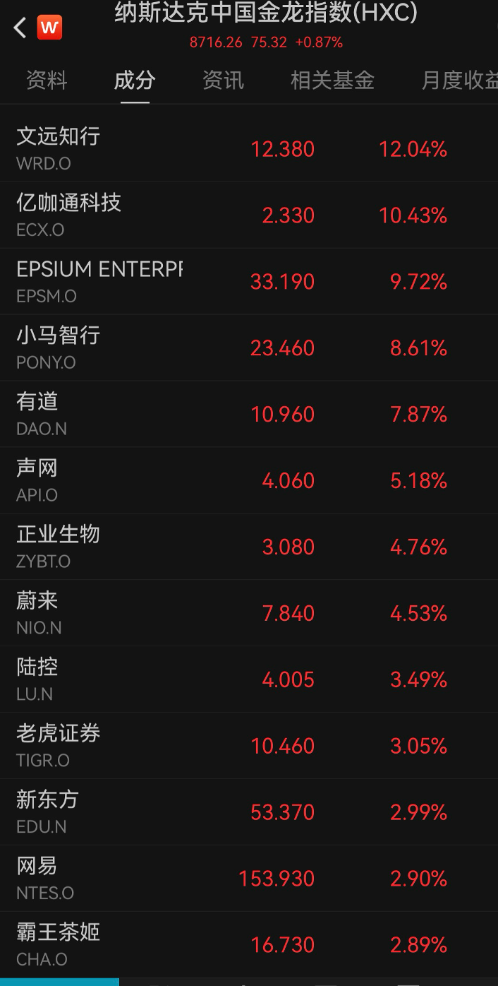 中概股多数上涨,纳斯达克中国金龙指数涨0.87%,万得中概科技龙头指数涨0.54%。个股方面,文远知行涨超12%,小马智行涨超8%,蔚来涨逾4%,老虎证券涨逾3%。爱奇艺跌近3%,雾芯科技跌超3%,满帮集团跌超2%,金山云跌逾1%。