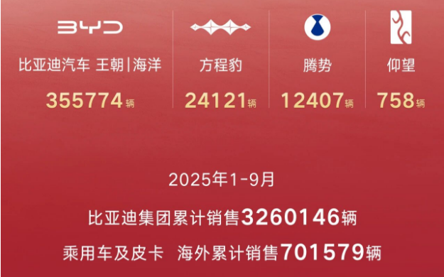 2025年1-9月份比亚迪汽车累计销量3260146辆,同比去年同期销量2736401辆辆增长19.1%。海外累计销量701579辆。