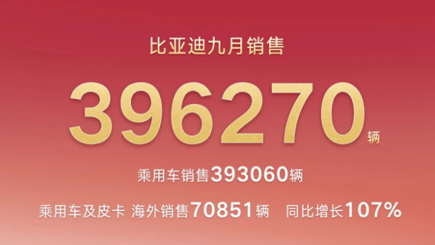 10月2日,自主5强比亚迪、奇瑞汽车、吉利汽车、长安汽车、长城汽车先后公布了9月份销量,其中,吉利、奇瑞、长安年度销量全部超200万辆,具体销量表现我们一起来看看吧!第一名比亚迪汽车,9月销量396270辆,乘用车销量393060辆,对比去年同期销量419,426辆(含乘用车417,603辆),同比下滑5.5%。海外销量70851辆,同比增长107%。
