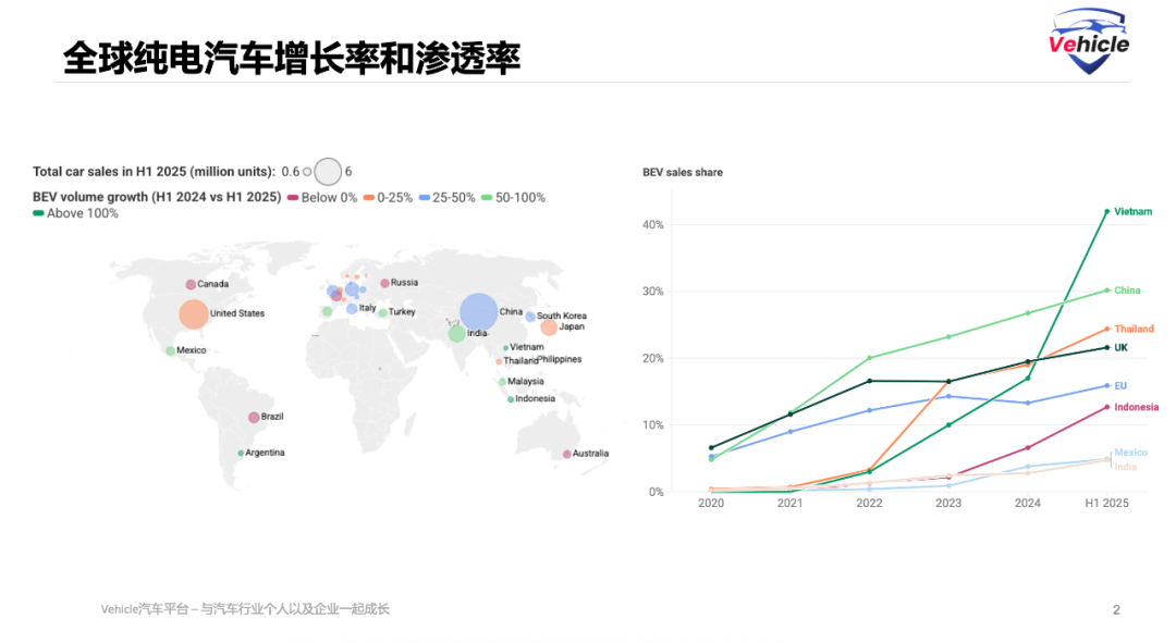 东南亚的印尼纯电市场正在快速兴起,2025年上半年纯电汽车同比增长更达到了惊人的158%,整个纯电的渗透率达到13%;越南纯电汽车的增长速度也超过100%,越南的 BEV 份额达到 42%;泰国的纯电汽车销量增长25%,整个纯电的渗透率达到34%。