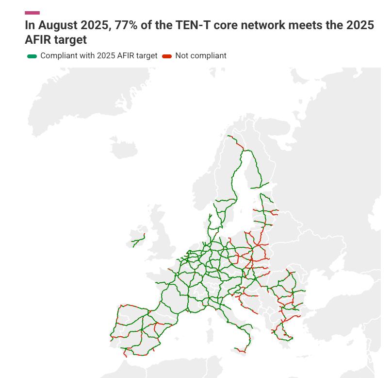 此外,法规还规定了轻型和重型道路车辆在TEN-T核心网络和综合网络上的行驶距离目标。法规还要求欧盟成员国确保在城市枢纽和安全可靠的停车场为重型车辆设置一定数量的充电站。