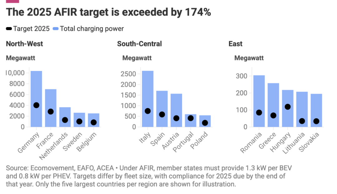 目前,所有欧盟国家都已超过了其 2025 年充电桩总数的既定目标。欧盟整体上,AFIR 目标被超额完成 174%。