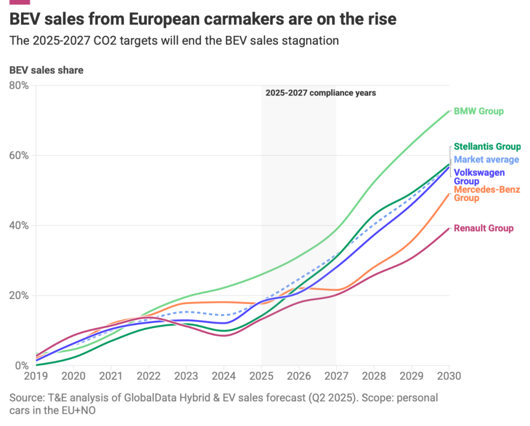 2025年欧洲主机厂的纯电汽车销量占比应该在18%左右;在2025年至2027年,纯电销量应该在25%左右,最终在2030年会在55%左右。