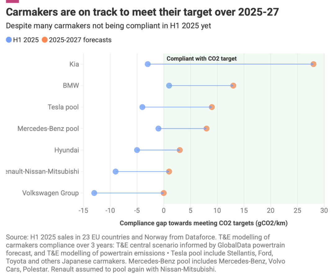 总体来讲,欧盟对于碳排放的法规总体目标并没有变,只是延缓了,因为从2025年各个主机厂的数据来看,基本上没有几家满足。