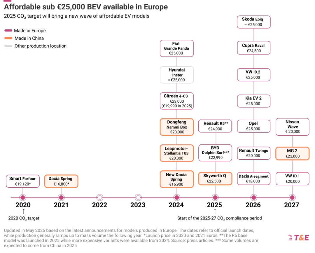 预计到 2025 年底将有 9 款经济型车型上市,到 2027 年底预计至少有 19 款。其中,越来越多的经济型车型将在欧洲制造,之前绝大部分来自于中国生产例如东风纳米、零跑T03、达契亚Spring、创维Q和韩国生产的Instar。接下来,大众和雷诺将会推出七八款欧洲生产的经济型小车,比亚迪的海豚也会在今年在欧洲本土生产。
