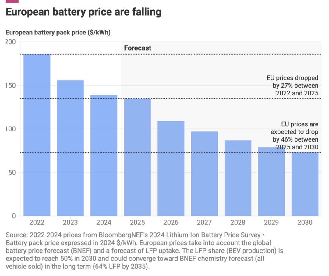 预计 2025 年至 2030 年间,电池的价格将下降 46%。主要原因是欧洲 LFP 电池份额的增加(预计到 2030 年达到 50%)支持了价格下跌。可以参考,中国在 2025 年已达到 67% 的 LFP 份额。