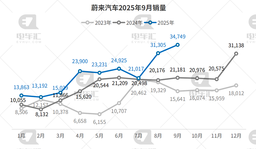蔚来汽车9月销量达34,749辆,同比增长64.1%,表现亮眼。其中,乐道品牌交付15,246辆,萤火虫品牌交付5,775辆,多品牌矩阵策略成效显著。新一代ES8上市后,通过推出电池租赁方案,将起售价降至29.88万元,成功撬动了中高端市场的消费需求,进一步扩大了客户群体。