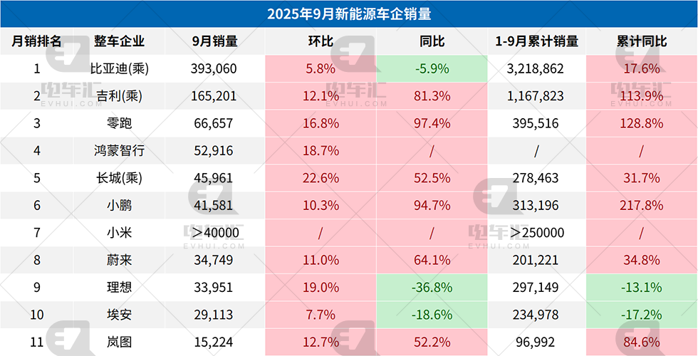 原文标题 : 9月新能源车企销量公布:比亚迪39.3万辆,吉利16.5万辆、零跑6.7万辆……