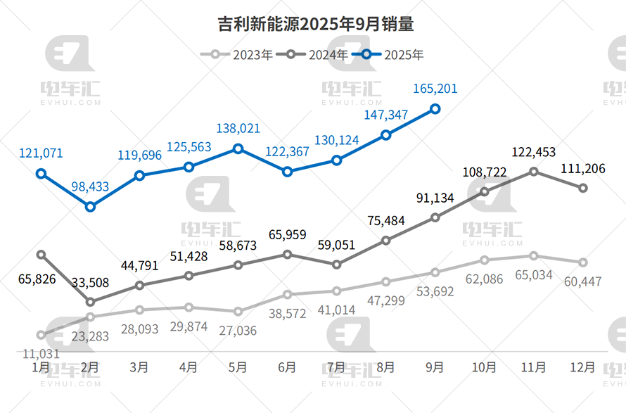 吉利新能源汽车9月销量达165,201辆,位居榜单第二,同比暴涨81.3%,环比增长12.1%,1-9月累计销量116.8万辆,同比增幅高达113.9%,增速在传统车企中表现突出。