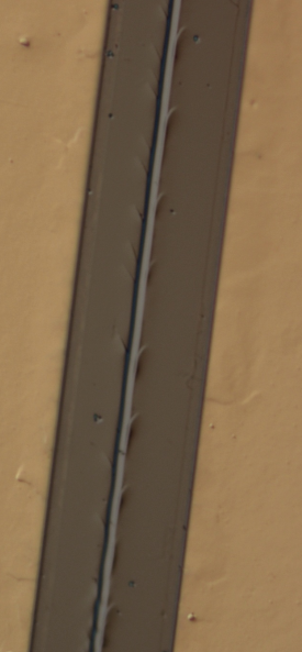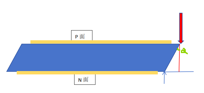 因此劈裂时,下刀的位置要相对于划线位置,进行一定距离的偏移。从理论上也可以计算,比如偏转角度a=10°,芯片厚度100um,偏移量就是tan10°X 95um=17um,也就是需要劈刀位置偏移N面的划线位置偏移17um。