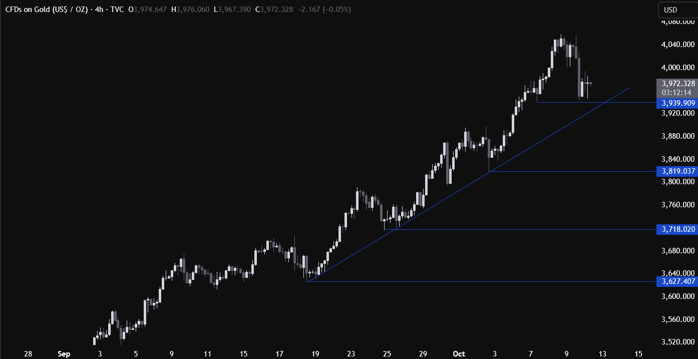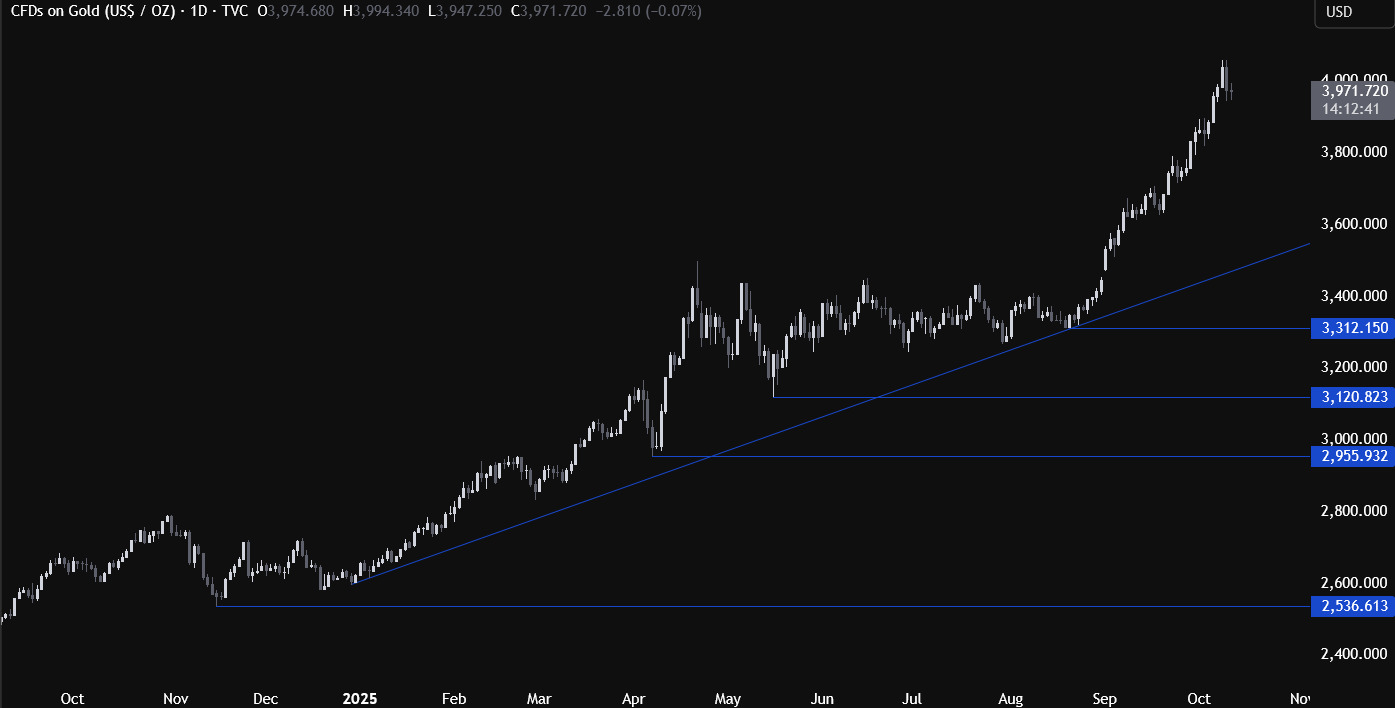 目前,市场主要依靠惯性推动,而在美国政府停摆的背景下,缺乏阻力来打断这波上涨趋势。美国劳工统计局(BLS)已宣布将继续公布CPI数据,但发布时间可能会推迟,这对多头而言存在潜在风险:若通胀数据高于预期,可能引发市场鹰派预期再定价,从而导致黄金出现更大幅度的回调。
