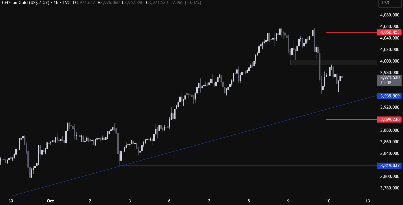 在4小时图中,可以看到一条上升趋势线正在支撑多头动能。买方可能会在趋势线附近进行布局,并将止损设置在趋势线下方,以期继续推动金价刷新历史高位。空头则会关注趋势线的下破,一旦跌破,可能进一步回调至3819美元区域。
