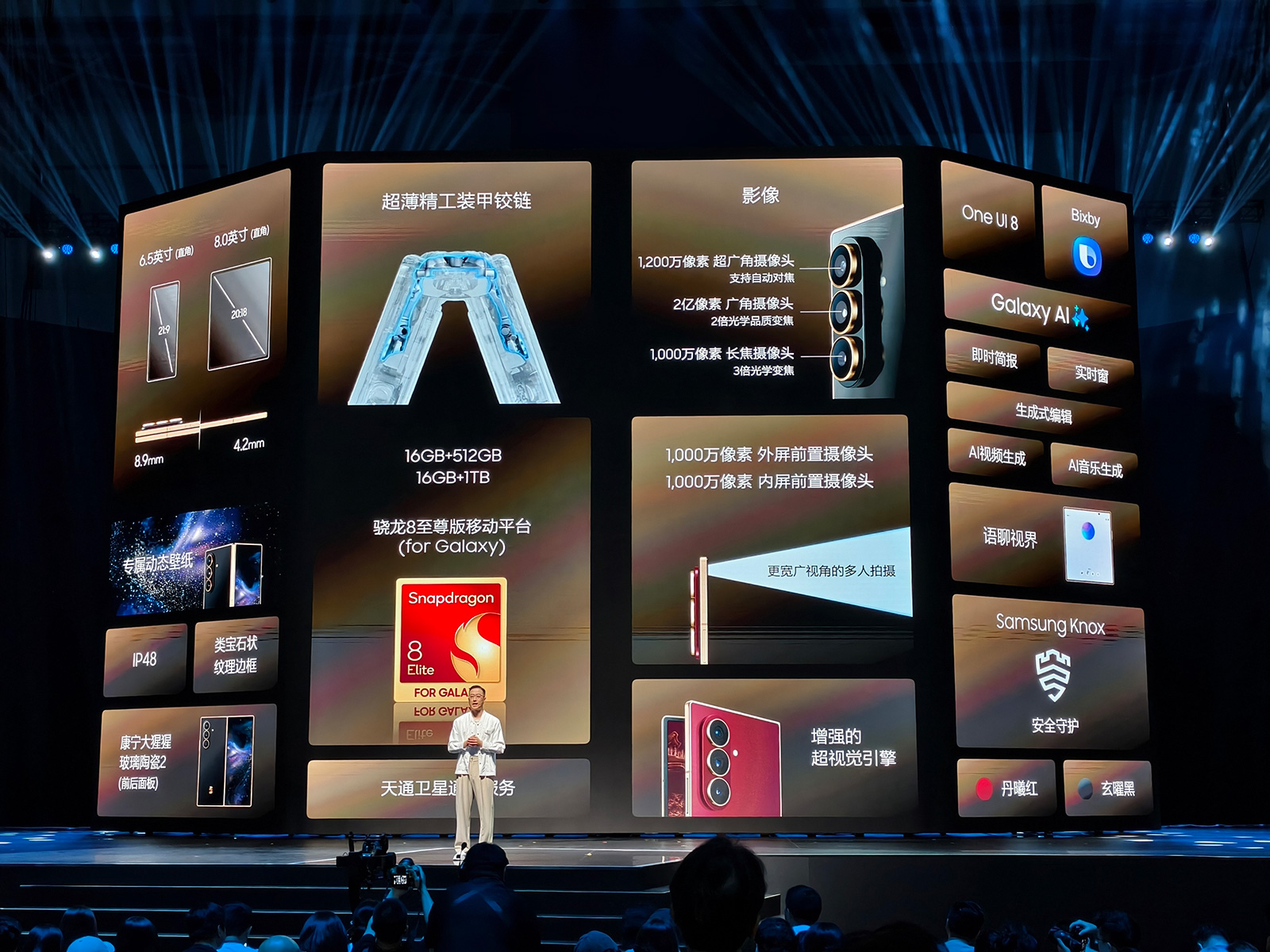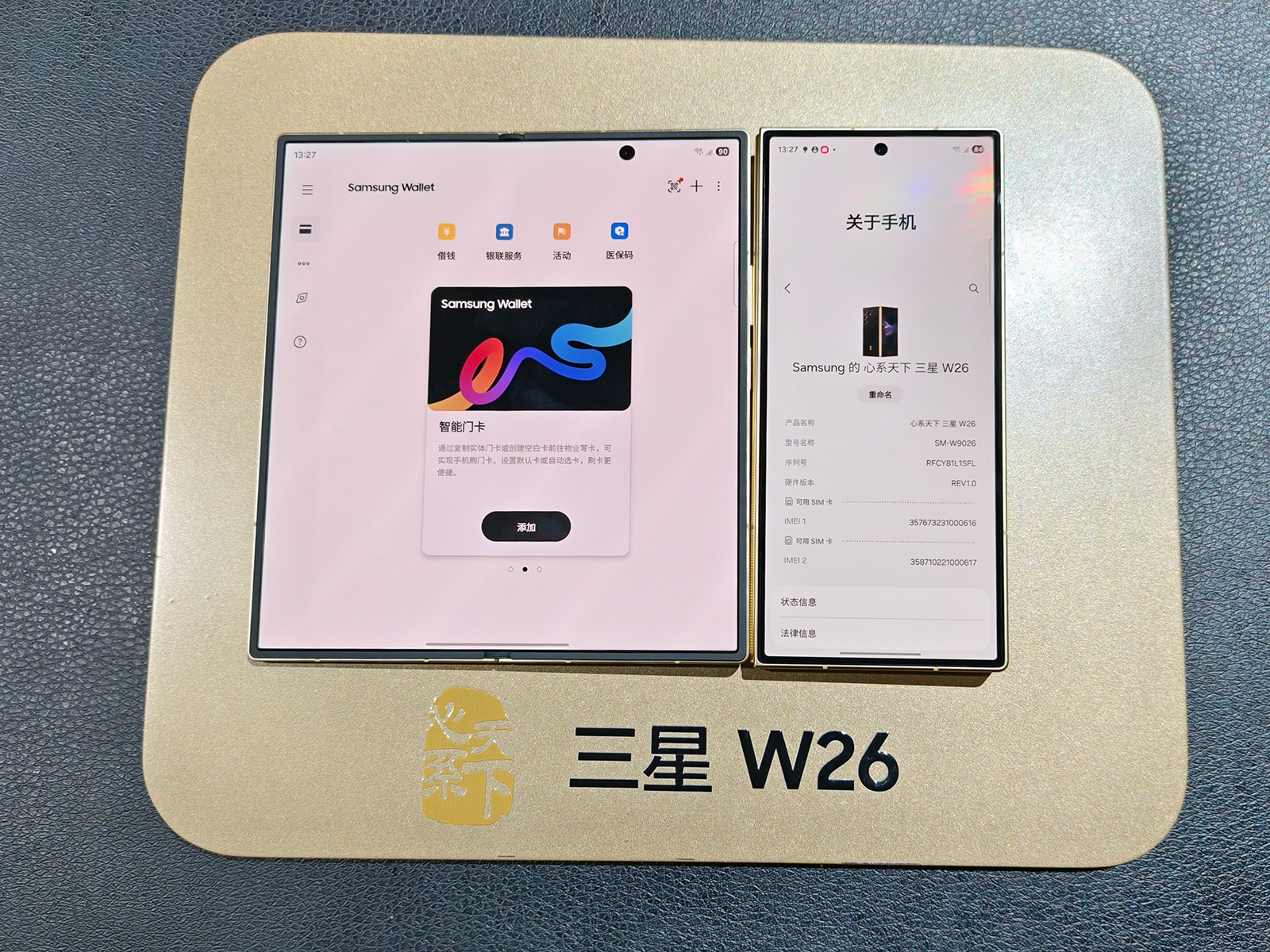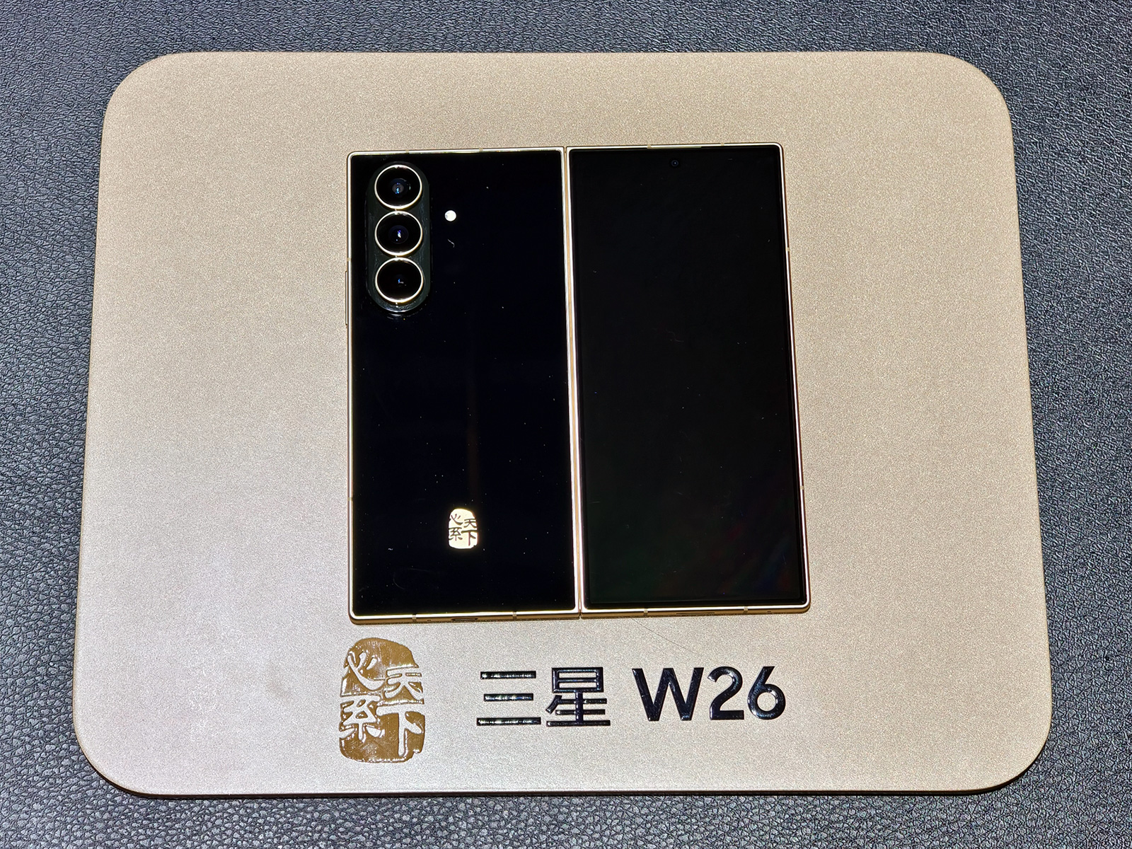 某种程度上三星W26可以视为在三星Galaxy Z Fold7基础上的加强版,外观同样拥有8.9毫米、215克的超轻设计,6.5英寸21:9的外屏,展开后大屏8.0英寸。内屏为第二代AMOLED显示屏,峰值亮度2600尼特,使用UTG超薄玻璃。三星W26前后背板均为康宁大猩猩玻璃陶瓷2代,采用超薄精工装甲铰链与增强型装甲铝边框,整机IP48级防尘防水,边框还加入了金色类宝石纹理,镜头圈为更具奢华感的鎏金色。