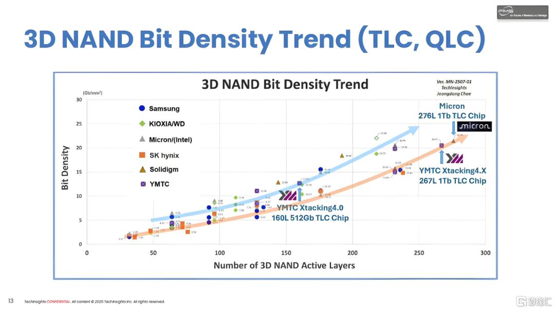 TechInsights展示了各大厂商在 3D NAND位密度(bit density) 上的演进趋势,横轴是堆叠层数,纵轴是单位面积的存储密度。可以看到,层数越高,代表技术越先进,也能带来更高的存储密度。
