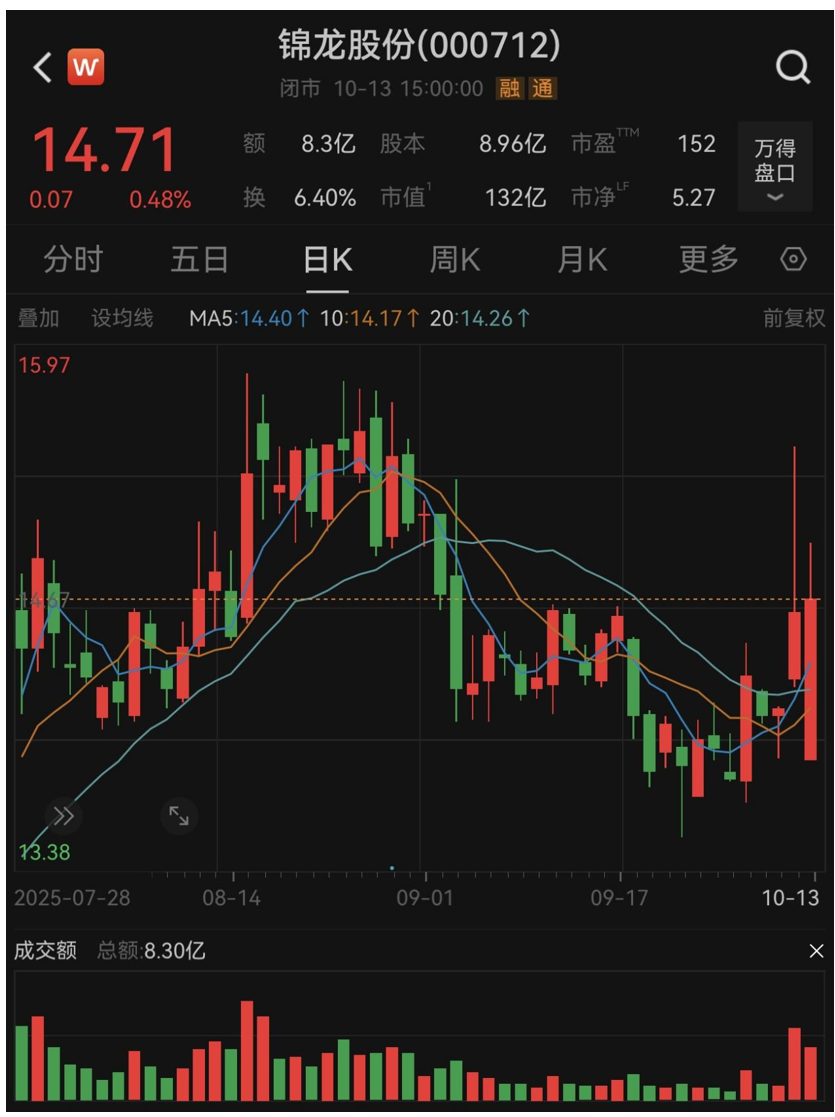 10月13日,锦龙股份股价收盘报14.71元/股。这意味着,上述3000万股的成交价折价14.8%。