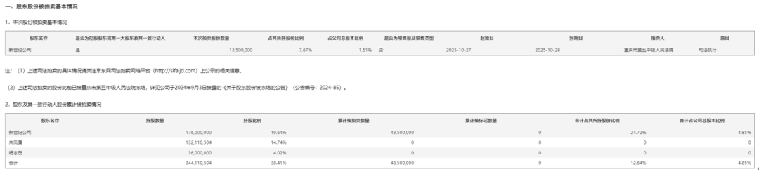 公司表示,若本次拍卖股份最终全部成交并完成过户,新世纪仍为控股股东,杨志茂仍为实际控制人。