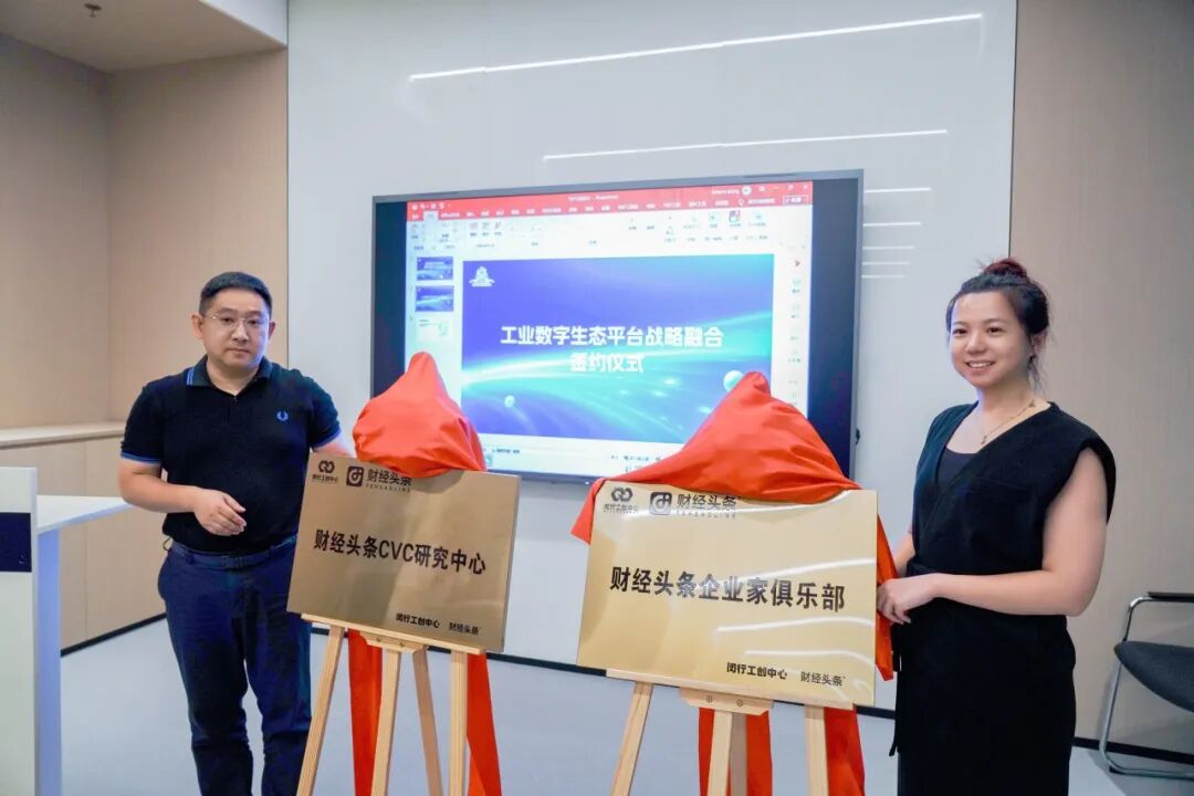 活动尾声,区数据局副局长贾菁与莘庄镇副镇长秦云啸共同签署工业数字生态平台战略融合协议;莘庄镇招商中心常务副主任周磊宾与财经头条CVC研究中心负责人龚艺携手为“财经头条 CVC 研究中心”挂牌闵行工创中心,融合协议的签署和研究中心的挂牌标志着区域工业数字化的创新升级发展。后续闵行区将以“数据要素×智能制造”为抓手,不断激发数据要素赋能制造发展潜力,加快形成新质生产力,推动全区数据产业高速发展。